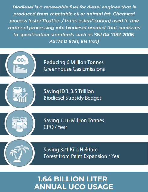 We export Used Cooking Oil that we collect from customers around the globe as renewable energy / biodiesel feedstock. We have collecting points in several major cities in Indonesia, such as Jakarta, Karawang, Surabaya, Samarinda, Medan, Pontianak and Pekanbaru. Those collecting point sourcing UCO from restaurants, snack producers, UCO collectors, and households UCO sent them from the collecting point to our storage facility to be sorted and stored. We only collect UCO from vegetable oil and export it as feedstock for renewable energy, not for human or animal consumption, in compliance with ISCC (International Sustainability and Carbon Certification).