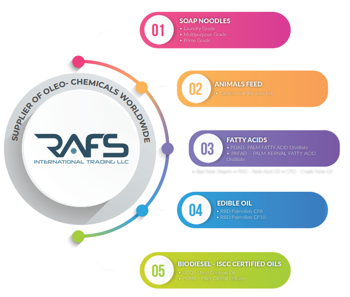RAFS INTERNATIONAL deals in wide range of palm oil by products, inedible oils, fats, biodiesel, raw materials and manufacture of soap noodles.